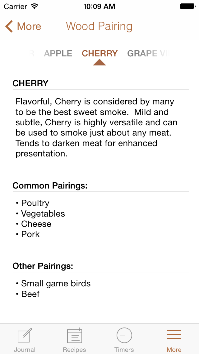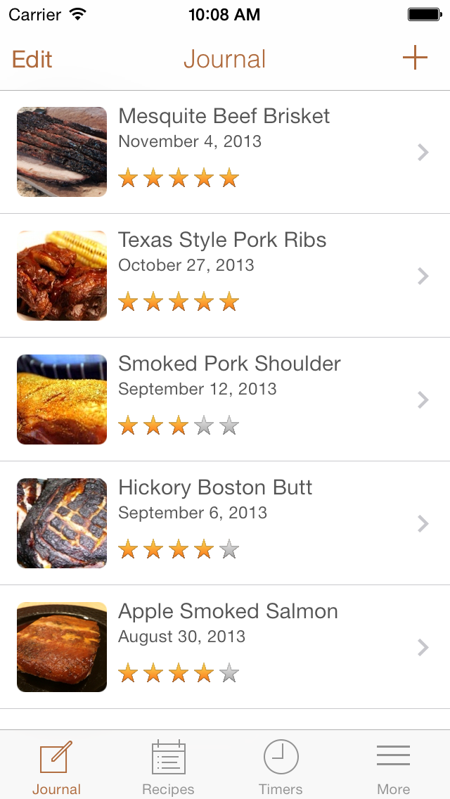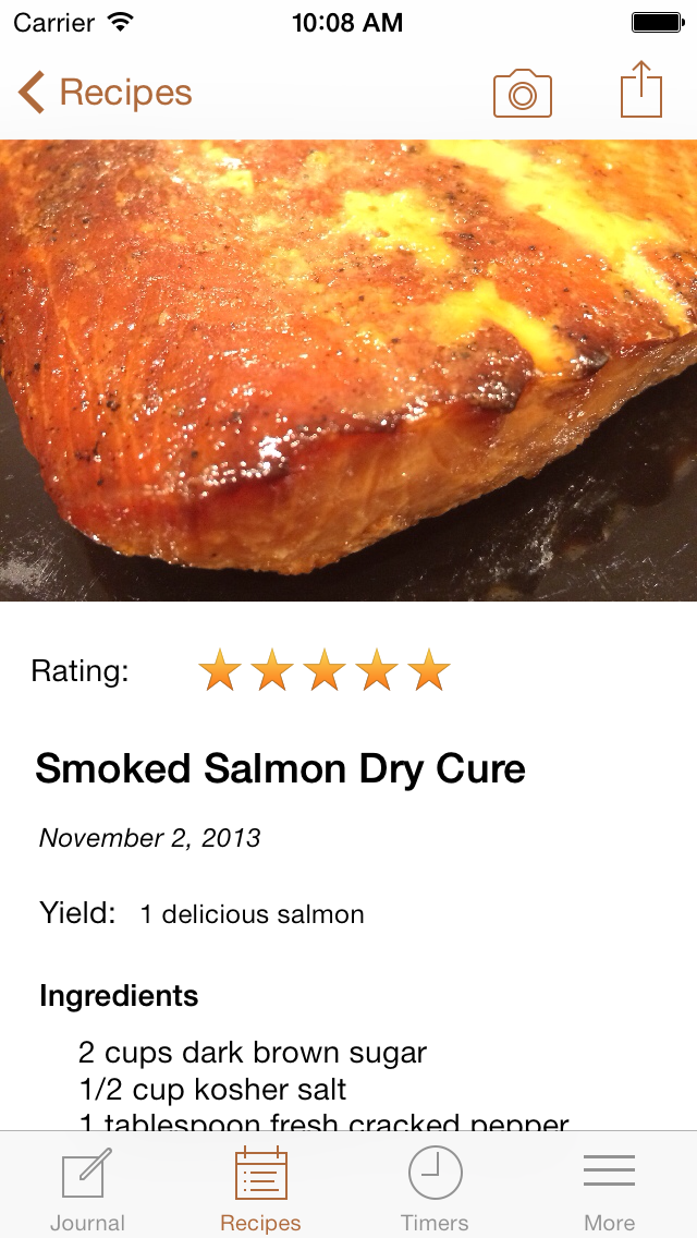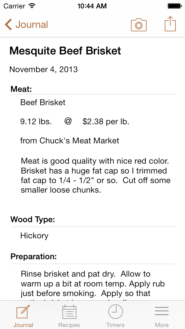 Smoked! is a great way to journal your food smoking progress and improve your technique. Capture details related to meat, smoking woods, preparation, rubs, bastes, mops, cures, weather, and your results. Add great looking photos of each stage of your progress.